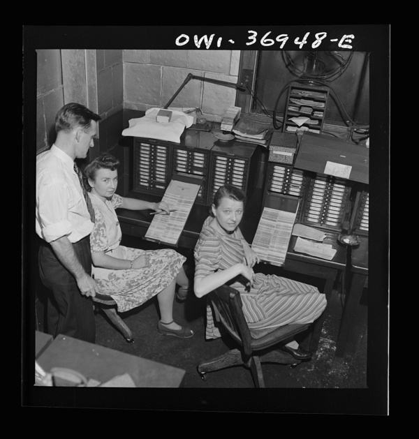 Pittsburgh, Pennsylvania. Part of the office staff with the card system which lists parts in the Greyhound garage