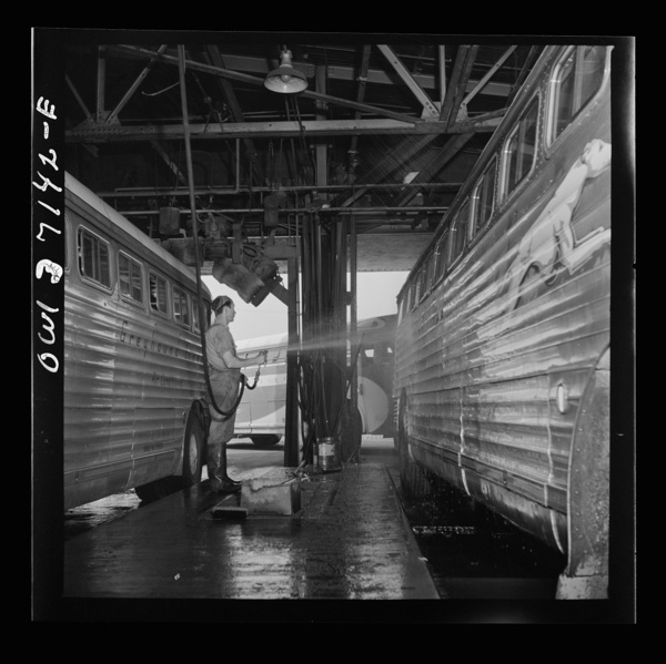 Pittsburgh, Pennsylvania. Washing a bus at the Greyhound garage