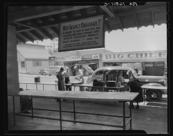 Plant quarantine inspector examining tourist baggage before entering California. Yuma, Arizona