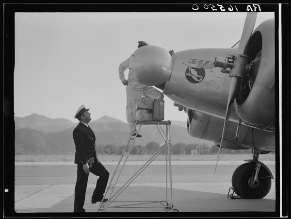 Plant quarantine inspectors examining plane at the Glendale Airport, California