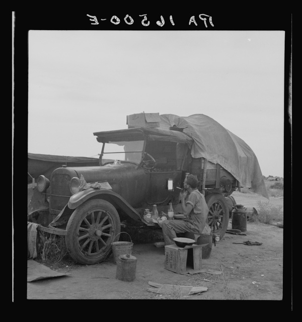 Family of drought refugees on U.S. 99 near Bakersfield, California