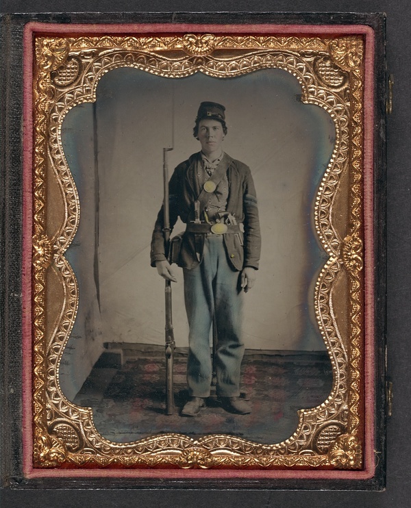 Unidentified soldier in Union uniform with bayoneted musket, cartridge box, and cap box