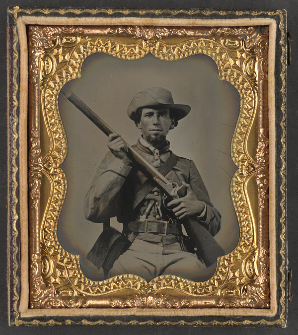 Private John P. Alldredge of Co. A, 48th Alabama Infantry Regiment in uniform and wishbone belt buckle with Model 1842 rifle musket, revolver, and side knife
