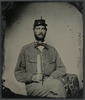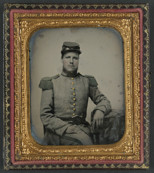 Private Joseph T. Rowland of Co. A, 41st Virginia Infantry Regiment in uniform with epaulets and kepi with pistol in belt