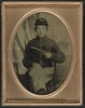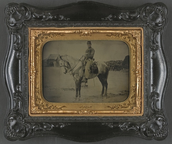 Private Levi F. Hocker of Co. F, 17th Pennsylvania Cavalry Regiment, in uniform with pistol and sword, on horseback