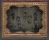 Five unidentified prisoners of war in Confederate uniforms in front of their barracks at Camp Douglas Prison, Chicago, Illinois