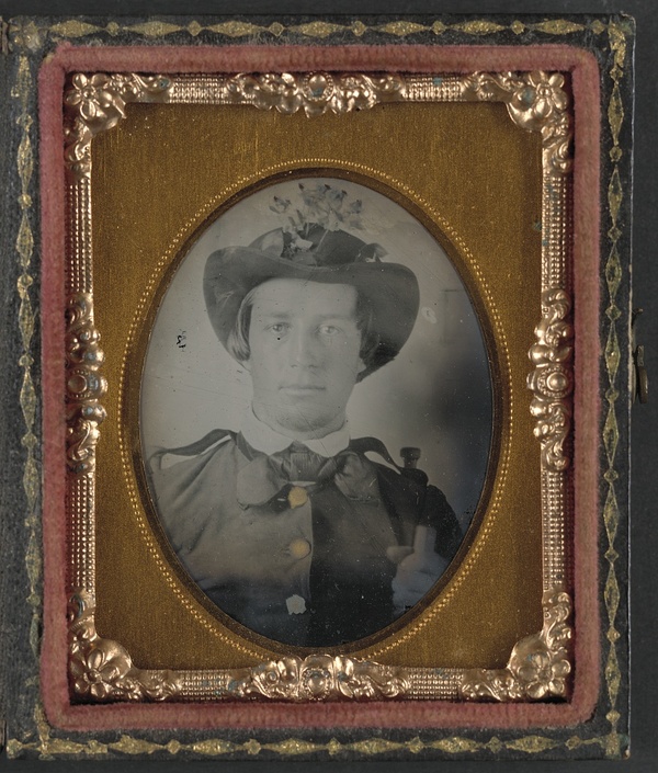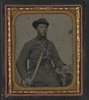 Unidentified soldier in Confederate uniform and Virginia sword belt plate with revolver and cavalry sword