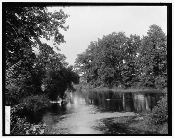 Buildings by river, probably the Huron River, Ypsilanti, Michigan