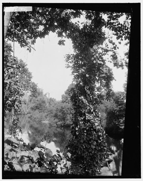 Riverscape with smokestack, probably the Huron River, Ypsilanti, Mich.