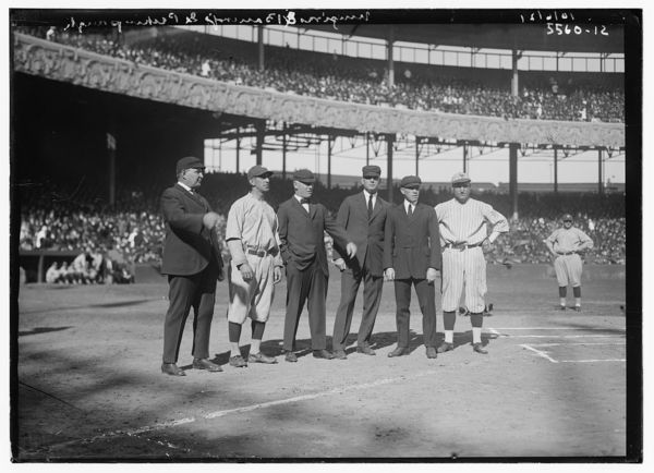 Roger Peckinpaugh, New York, AL (left), and Dave Bancroft, New York, NL (right), with umpires at Polo Grounds, World Series, 1921 (baseball)