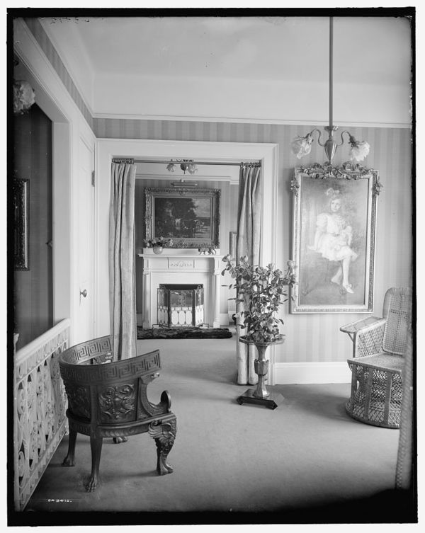 Room with painting of child, roses, and portiere