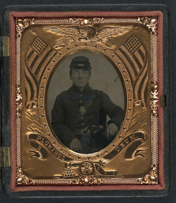 Roswell K. Bishop of Company I, 123rd New York Infantry Regiment in uniform with holstered revolver