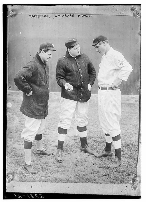 Rube Marquard standing at right, (Libe?) Washburn in center & Mike Donlin standing at left, New York, NL (baseball)