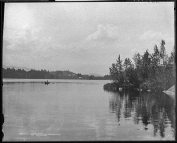 Rustic lodge and Indian carry, Upper Saranac Lake, Adirondack Mountains