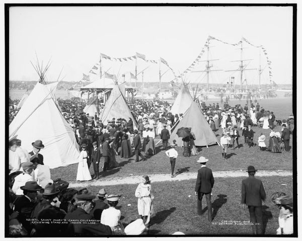 Saint Mary's i.e. Sault Sainte Marie Canal celebration, reviewing stand and Indian village