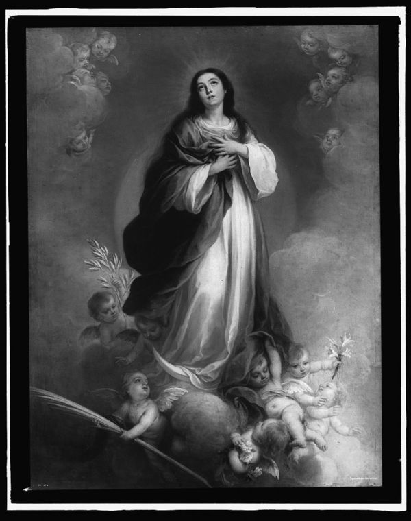 Saint, possibly Virgin Mary, standing on cloud surrounded by cherubs