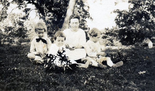 Sallie Moore Short and her nieces Kitty, Mary Lois, and Martha playing in the leaves on the Moore Homeplace