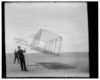 Side view of glider flying as a kite near the ground, Wilbur at left and Orville at right, glider turned forward to right and tipped downward