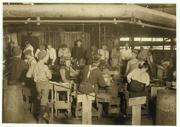 Scene in More-Jonas i.e., Jones? Glass Co., Bridgeton, N.J. Several young boys are to be seen in photo. Location: Bridgeton, New Jersey.