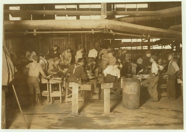 Scene in More-Jonas i.e., Jones? Glass Co., Bridgeton, N.J. Several young boys are to be seen in photo. Location: Bridgeton, New Jersey.