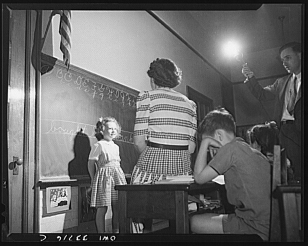 Schenectady, New York. After the child at the Elmer Avenue Elementary School has finished her written spelling examination on the blackboard, she takes her oral examination