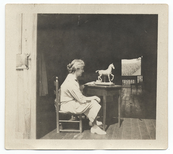 Sculptor Malvina Hoffman working on a sculpture around 1920