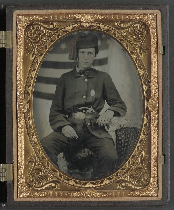 Sergeant Albert S. Brownson of Company G, 12th Indiana Infantry Regiment, and Company D, 5th Indiana Cavalry Regiment, in uniform and upside down U.S. belt buckle with revolver in front of American flag backdrop