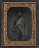 Unidentified cavalry soldier in Union uniform with Sharps carbine rifle, Colt revolver, and cavalry saber