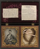 Private James W. McCulloch of Co. E, 7th Georgia Infantry Regiment holding wooden canteen, with lock of hair, obituary, and poem in case