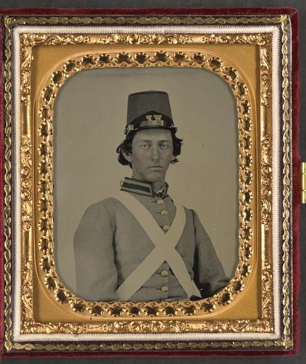 Sergeant Elijah McClanahan Ingles of Co. G, 4th Virginia Infantry Regiment in uniform, cap with "WF" (Wise Fencibles), and Virginia seal belt buckle