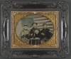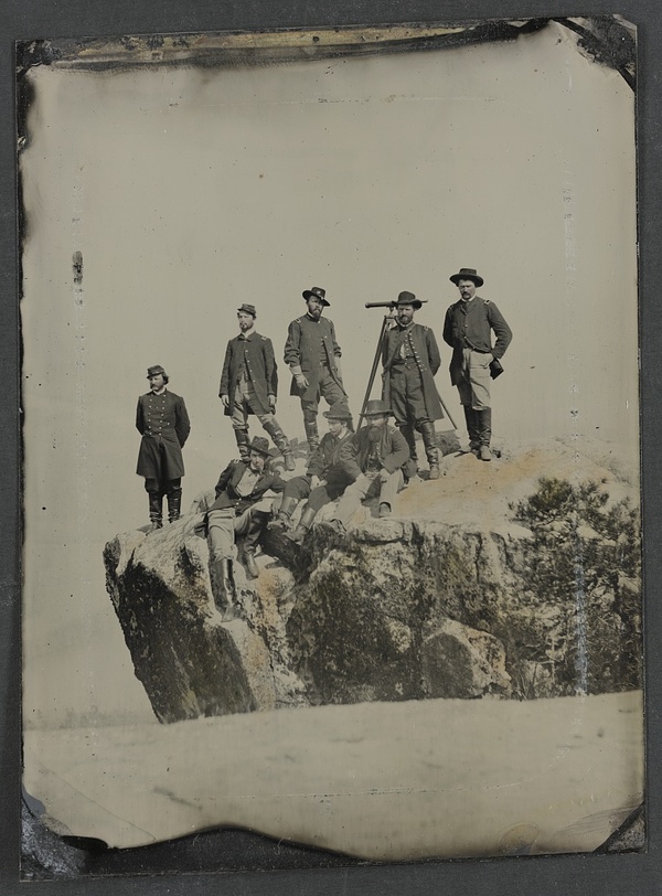 Seven unidentified officers and soldiers in Union uniforms and one officer identified as Major Charles S. Cotter of 1st Ohio Light Artillery Regiment, with telescope, at Point Lookout, Tennessee