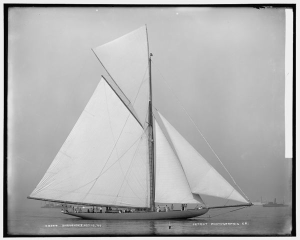 Shamrock I and Columbia, becalmed in fog