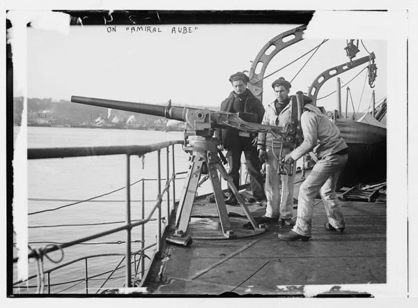 Two sailors in bayonet drill aboard deck of Amiral Aube, French ship