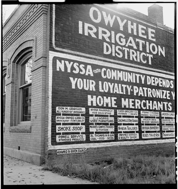 Sign on old bank building which now houses office of Bureau of Reclamation. Nyssa, Malheur County, Oregon