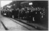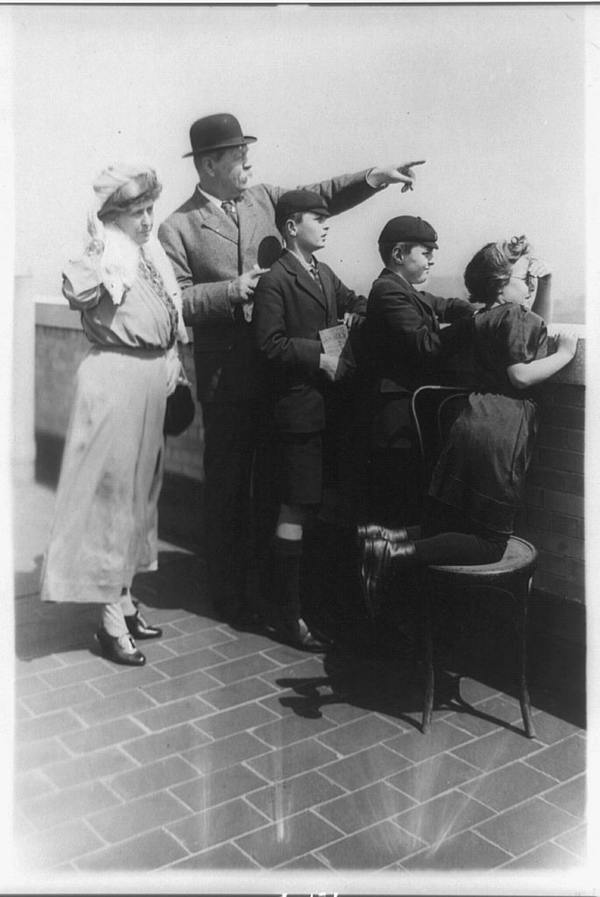 Sir Arthur Conan Doyle and family looking over wall and pointing, New York City