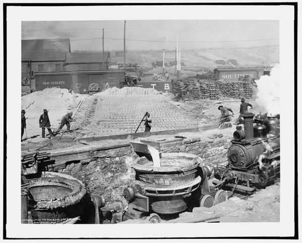 Slag run and filling slag pots, Sloss City furnaces, Birmingham, Ala.