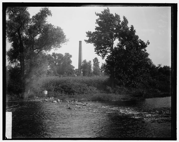 Smokestack by river, probably the Huron River, Ypsilanti, Michigan