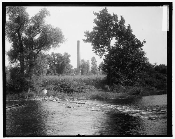 Smokestack by river, probably the Huron River, Ypsilanti, Michigan