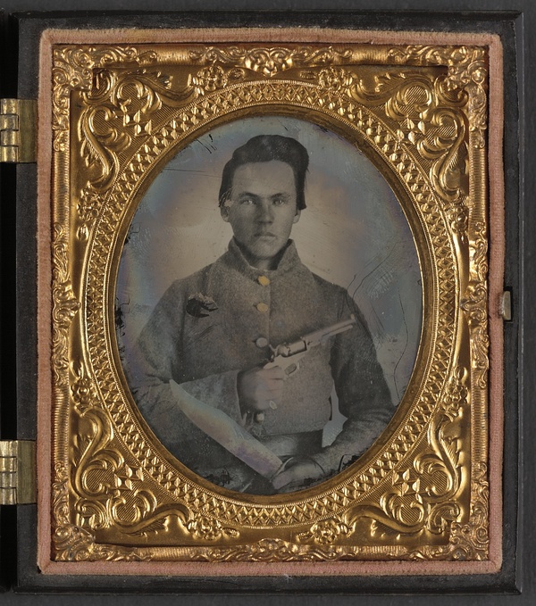 Soldier named E.F. Powell in Confederate uniform with Bowie knife and revolver
