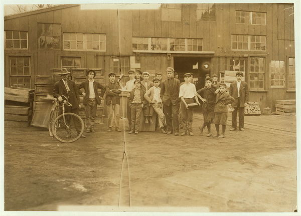 Some of night shift waiting to go to work. Cumberland Glass Works, Bridgeton, N.J. One boy is 13 years old. Location: Bridgeton, New Jersey.