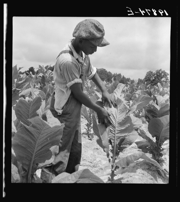 Son of sharecropper "worming" tobacco. Wake County, North Carolina