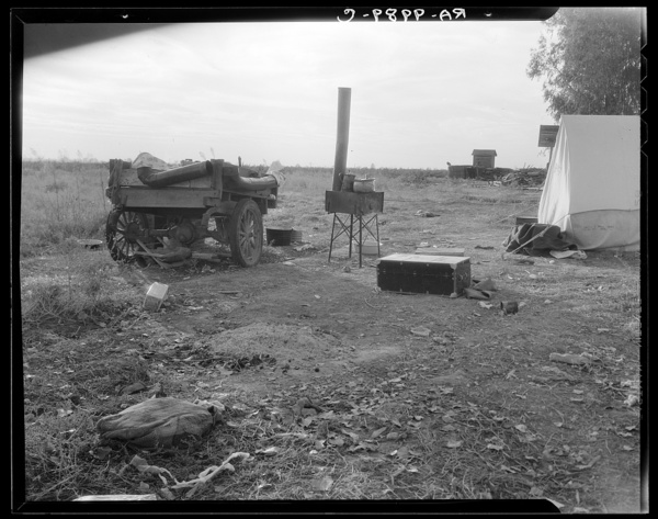1936 drought refugee from Polk, Missouri. Awaiting the opening of orange picking season at Porterville, California
