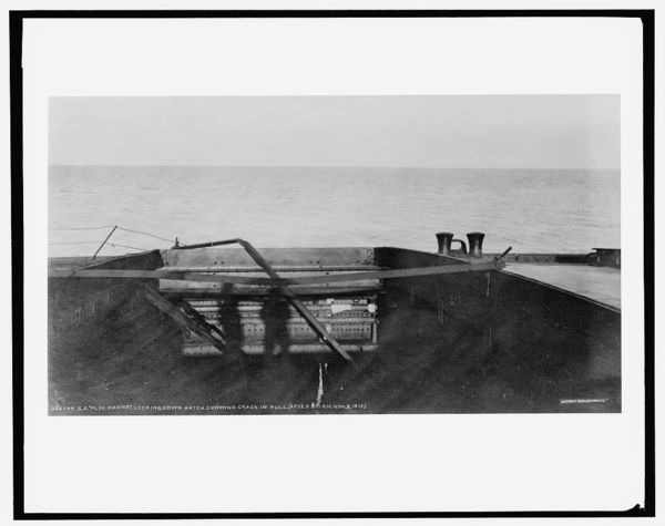 S.S. M.W. i.e. Howard M. Hanna, looking down hatch, showing crack in hull after storm