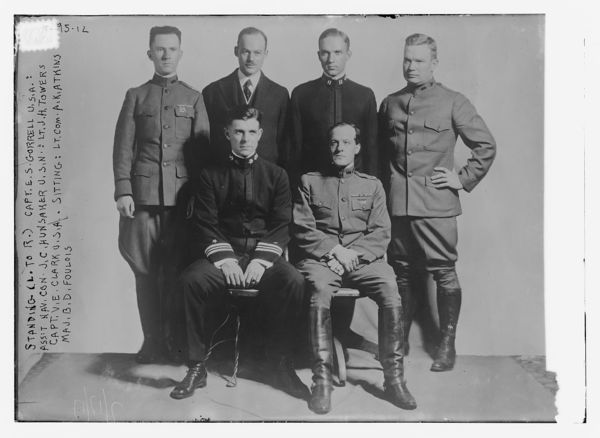 Standing (L to R) Capt. E.S. Gorrell, U.S.A.; Ass't Nav. Con. J.C. Hunsaker, U.S.N.; Lt. J.H. Towers, Capt. V.E.Clark, U.S.A.; sitting: Lt. Com. A.K. Atkins, & Maj. B.D. Foulois