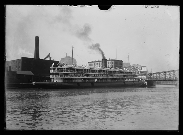 Steamer Christopher Columbus from Duluth passing industrial buildings