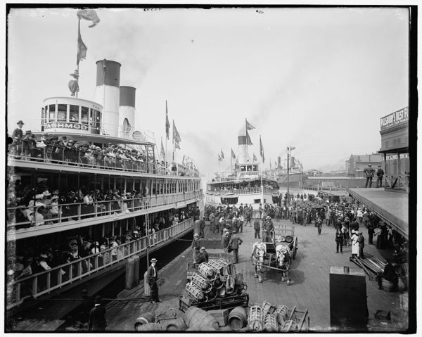 Excursion steamers Tashmoo and Idlewild at wharves, Detroit