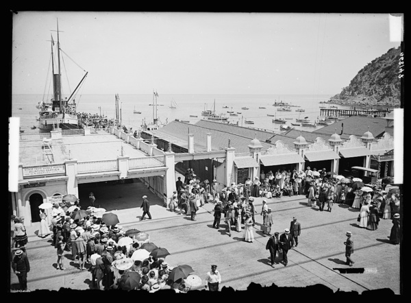 Steamship at pier by boardwalk, Avalon, Catalina Island, Calif.
