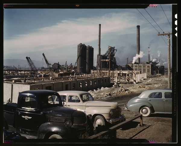 Partly finished open hearth furnaces and stacks for a steel mill under construction which will soon be producing vitally needed steel, Columbia Steel Co., Geneva, Utah