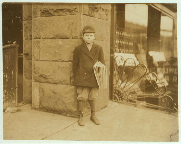 Stephen Yankus - 350 Newark St., 8 yrs. old, and works till 10 P.M. Saturdays. Photo taken at Hudson Place and River Street at 4 P.M. Location: Hoboken, New Jersey.