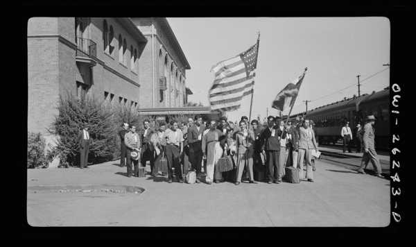 Stockton (vicinity), California. Mexican agricultural laborers arriving by train to help in the harvesting of beets
